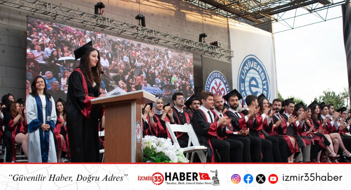 Ege Üniversitesi Tıp Fakültesi (EÜTF) 2024-2025 Akademik Yılı Mezuniyet Töreni, Bornova Aşık Veysel Rekreasyon Alanı Amfi Tiyatroda yapıldı. Egeli hekimler, ant içerek mesleğe ilk adımlarını attı. Mezuniyet törenine; EÜ Rektör Yardımcısı ve Tıp Fakültesi Dekanı Prof. Dr. Devrim Bozkurt, fakülte üst yönetimi, akademisyenler, öğrenciler ve aileleri katıldı. Saygı duruşu ve İstiklal Marşı’nın okunması ile başlayan törende öğrencilerin hazırladığı video gösterimi gerçekleştirildi.